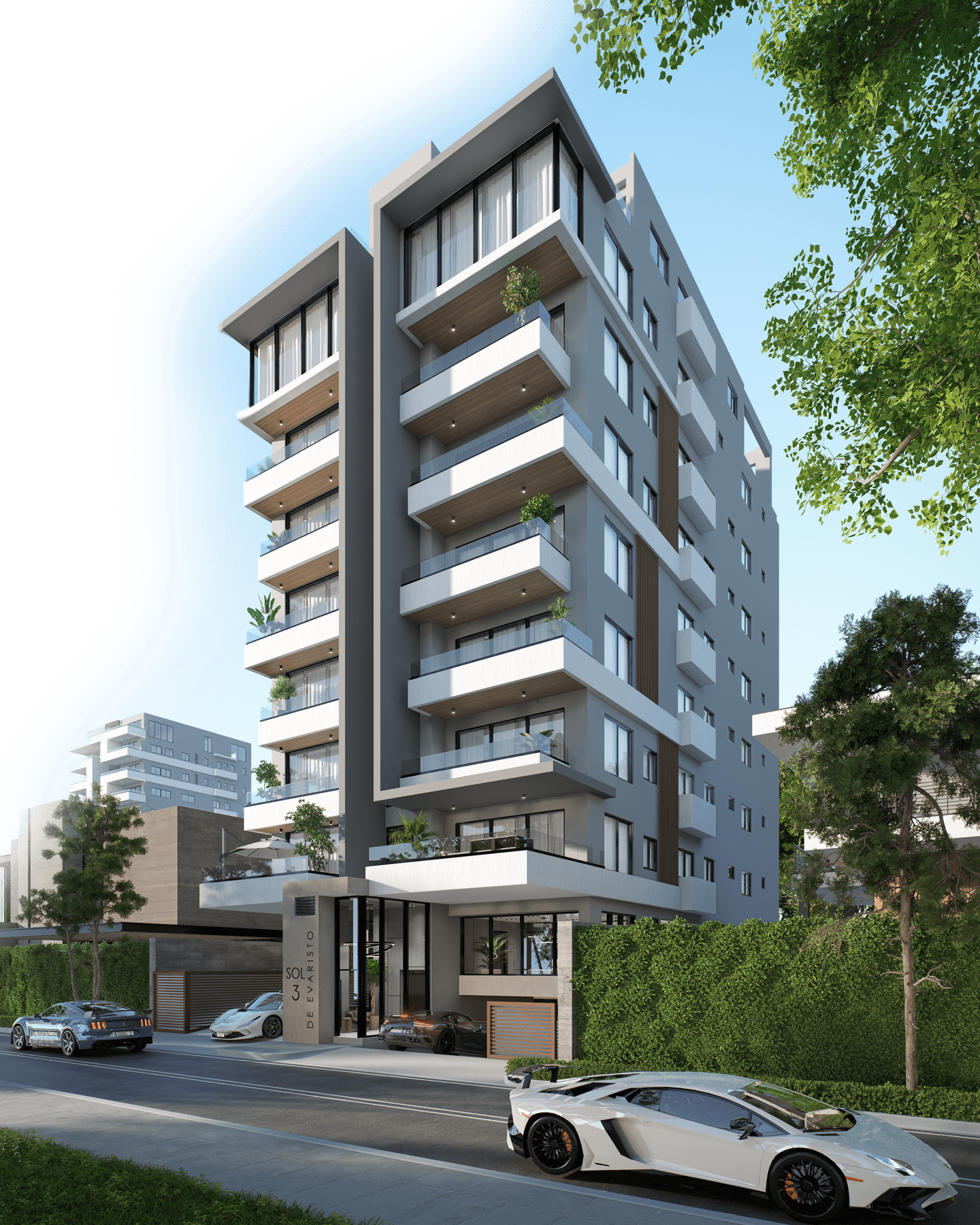Sol de Evaristo consta con dos niveles de parqueos, siete niveles de apartamentos y un octavo nivel de áreas comunes + terraza.